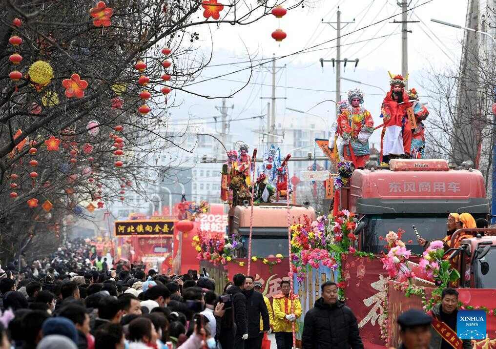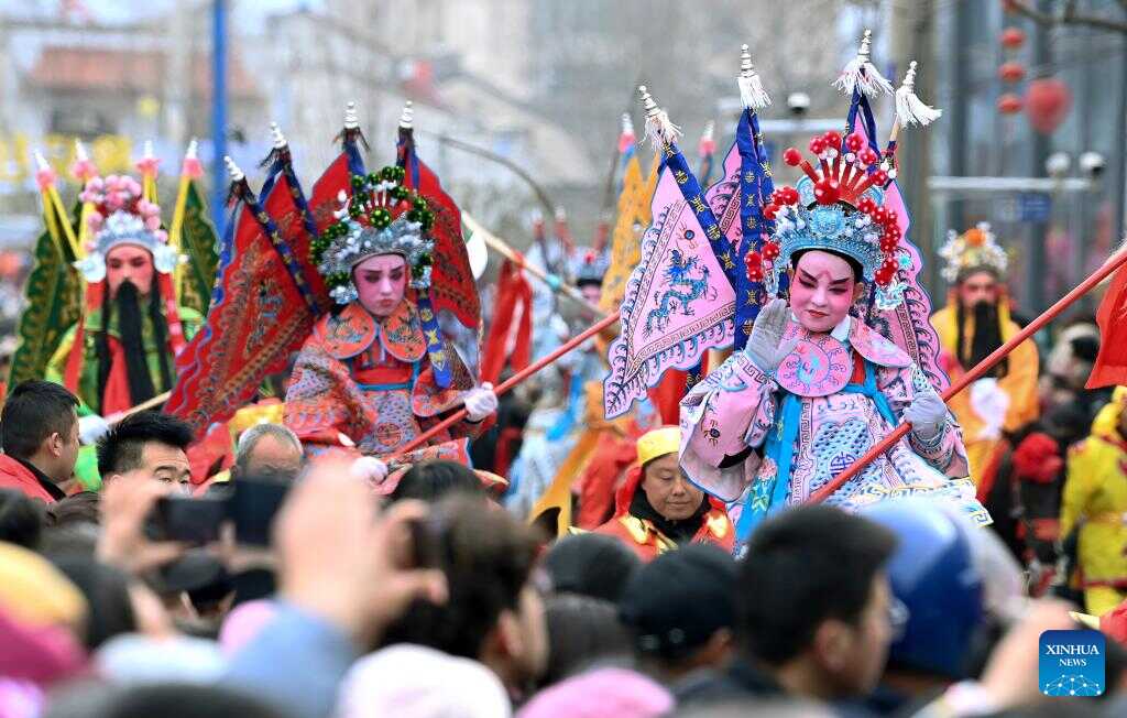 People watch a Shehuo parade celebrating the Lantern Festival in Longxian County of Baoji City, northwest China's Shaanxi Province, Feb. 12, 2025. Longxian County, referred to as Long Zhou in the old days, is well-known for the local Shehuo parade featuring authentic and inclusive performance and simple yet exquisite facial make-up. (Xinhua/Zou Jingyi)
