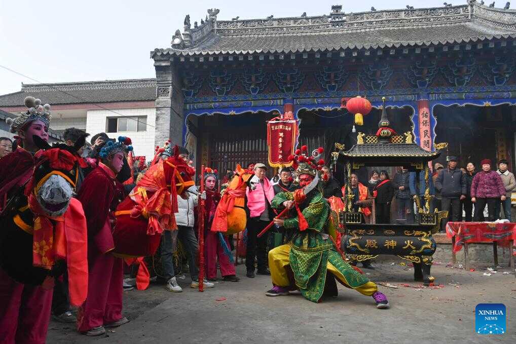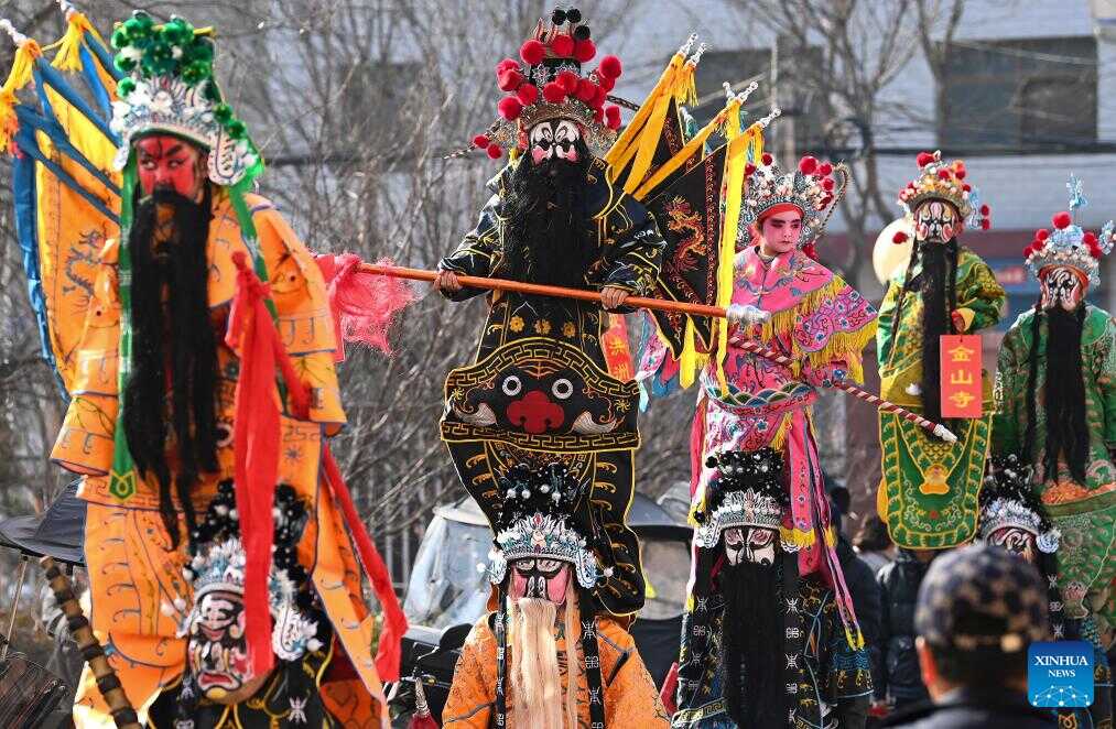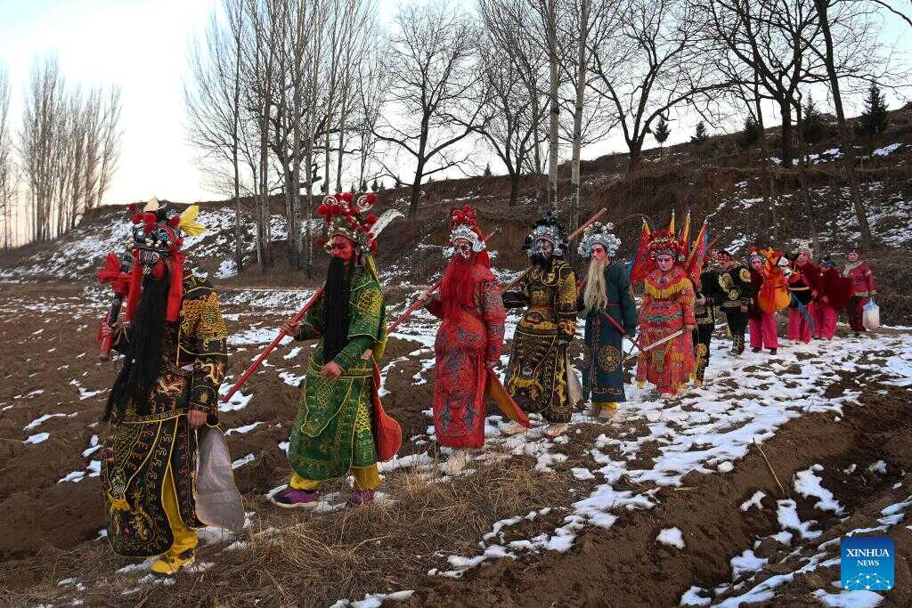 Performers rehearse a Shehuo parade in Longxian County of Baoji City, northwest China's Shaanxi Province, Feb. 10, 2025. Longxian County, referred to as Long Zhou in the old days, is well-known for the local Shehuo parade featuring authentic and inclusive performance and simple yet exquisite facial make-up. (Xinhua/Zou Jingyi)