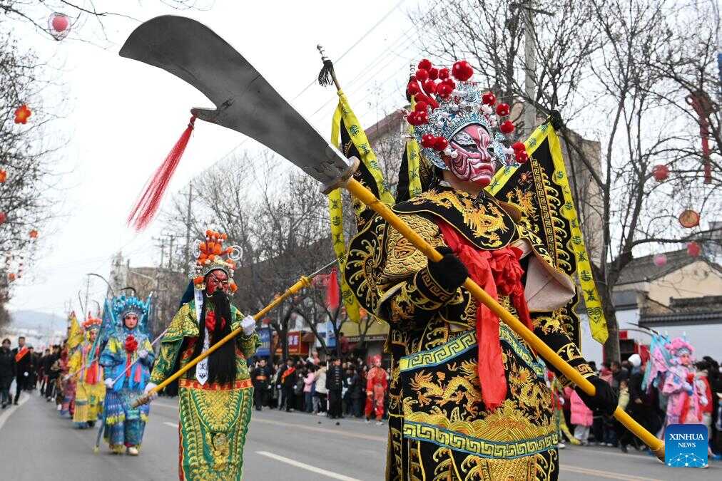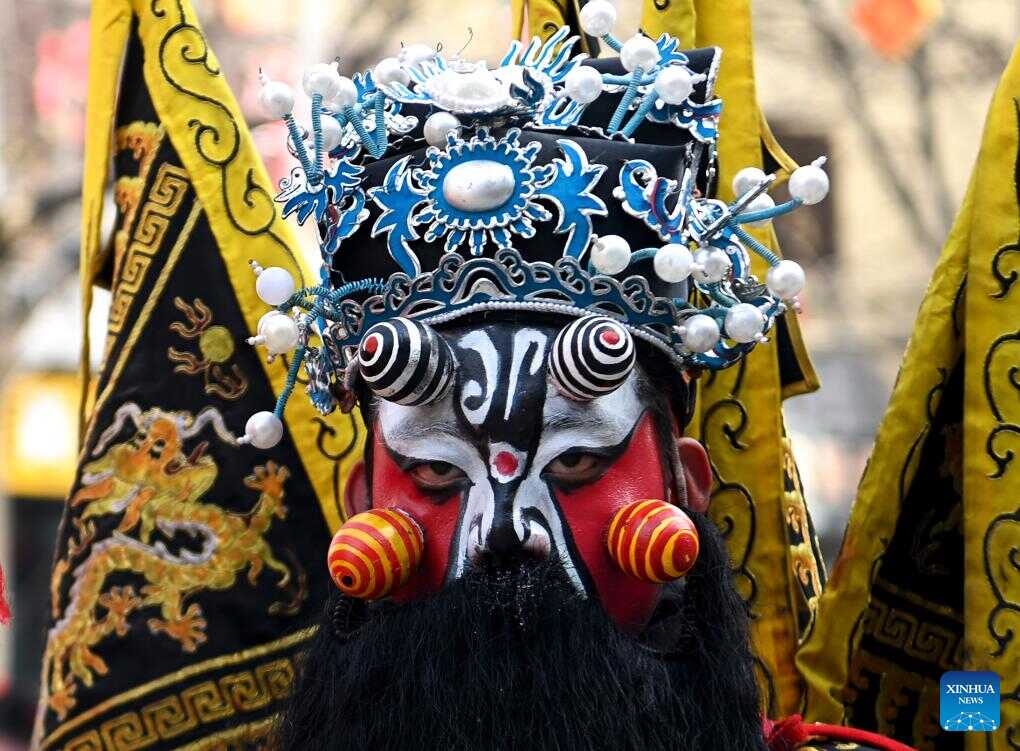Performers attend a Shehuo parade in Longxian County of Baoji City, northwest China's Shaanxi Province, Feb. 9, 2025. Longxian County, referred to as Long Zhou in the old days, is well-known for the local Shehuo parade featuring authentic and inclusive performance and simple yet exquisite facial make-up. (Xinhua/Zou Jingyi)