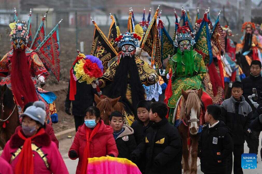 Performers attend a Shehuo parade in Sanliying Village in Longxian County of Baoji City, northwest China's Shaanxi Province, Feb. 9, 2025. Longxian County, referred to as Long Zhou in the old days, is well-known for the local Shehuo parade featuring authentic and inclusive performance and simple yet exquisite facial make-up.(Xinhua/Zou Jingyi)