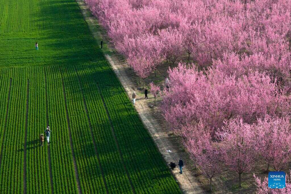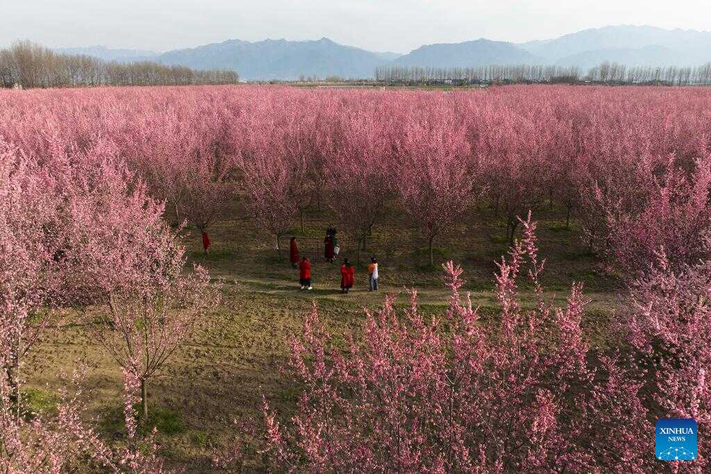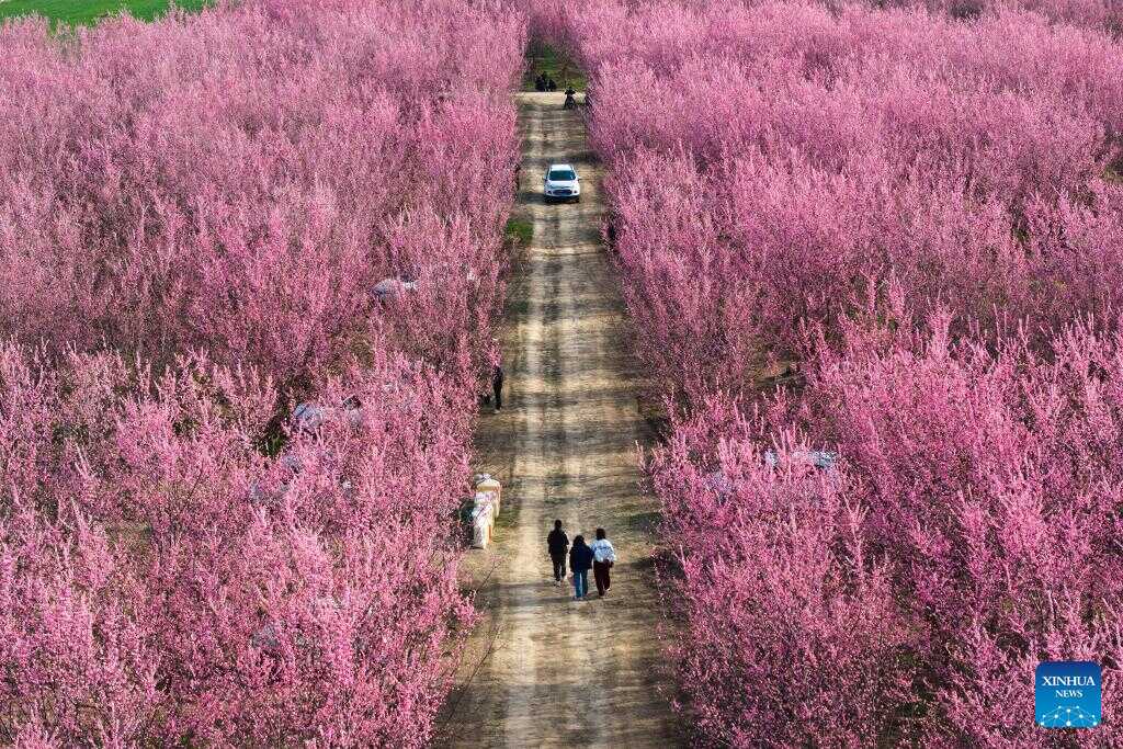 Aerial drone photos taken on March 18, 2025, show tourists enjoying blooming plum flowers at a plantation in Huyi District of Xi'an, northwest China's Shaanxi Province. (Xinhua/Shao Rui)