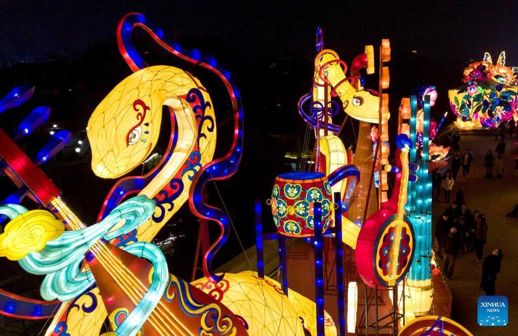 An aerial drone photo taken on Jan. 22, 2025 shows lanterns displayed at the Tang Paradise during the 2025 Chang'an Lantern Festival in Xi'an, northwest China's Shaanxi Province. The 2025 Chang'an Lantern Festival officially opened here on Wednesday to mark the upcoming Chinese Lunar New Year. The event will last until March 16, showcasing light installations at landmark scenic areas such as the Xi'an City Wall, the Tang Paradise, and the Daming Palace National Heritage Park. (Xinhua/Shao Rui)