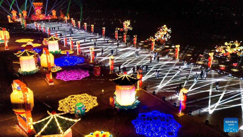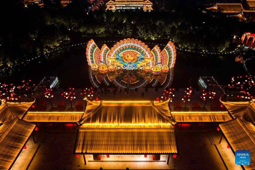 An aerial drone photo taken on Jan. 22, 2025 shows people visiting the Tang Paradise during the 2025 Chang'an Lantern Festival in Xi'an, northwest China's Shaanxi Province. The 2025 Chang'an Lantern Festival officially opened here on Wednesday to mark the upcoming Chinese Lunar New Year. The event will last until March 16, showcasing light installations at landmark scenic areas such as the Xi'an City Wall, the Tang Paradise, and the Daming Palace National Heritage Park. (Xinhua/Shao Rui)