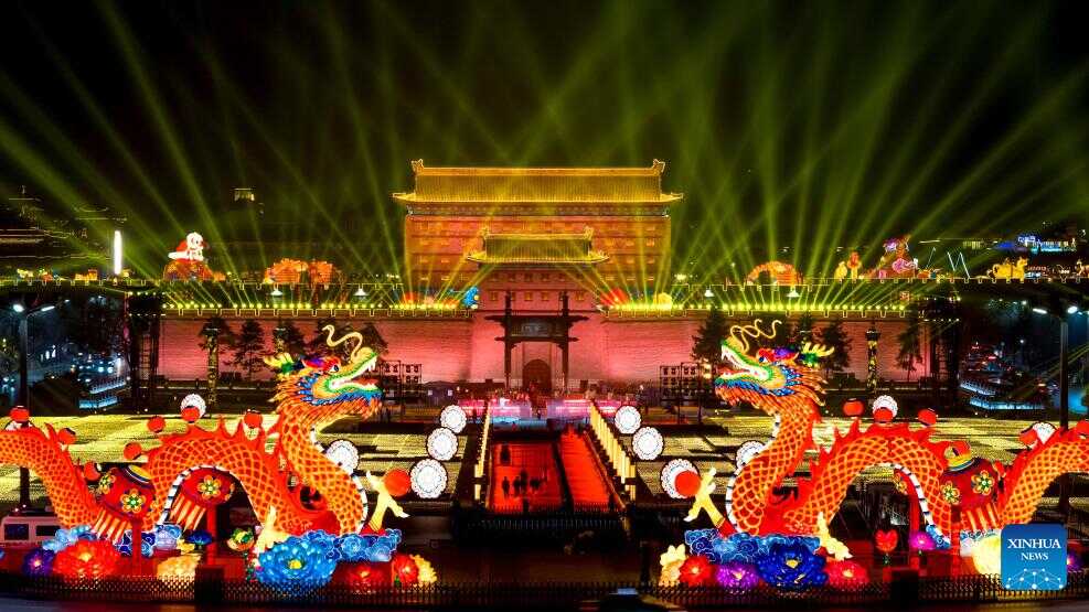 A drone photo taken on Jan. 22, 2025 shows lanterns displayed near the city wall of Xi'an during the 2025 Chang'an Lantern Festival in Xi'an, northwest China's Shaanxi Province. The 2025 Chang'an Lantern Festival officially opened here on Wednesday to mark the upcoming Chinese Lunar New Year. The event will last until March 16, showcasing light installations at landmark scenic areas such as the Xi'an City Wall, the Tang Paradise, and the Daming Palace National Heritage Park. (Xinhua/Zou Jingyi)
