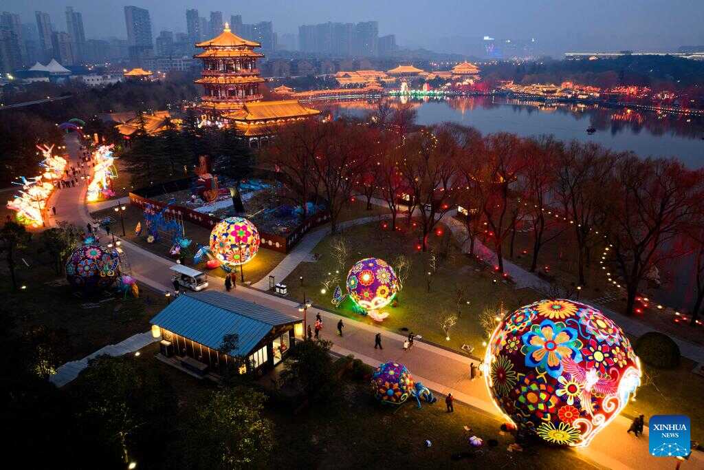 An aerial drone photo taken on Jan. 22, 2025 shows visitors taking photos of lanterns at the Tang Paradise during the 2025 Chang'an Lantern Festival in Xi'an, northwest China's Shaanxi Province. The 2025 Chang'an Lantern Festival officially opened here on Wednesday to mark the upcoming Chinese Lunar New Year. The event will last until March 16, showcasing light installations at landmark scenic areas such as the Xi'an City Wall, the Tang Paradise, and the Daming Palace National Heritage Park. (Xinhua/Shao Rui)