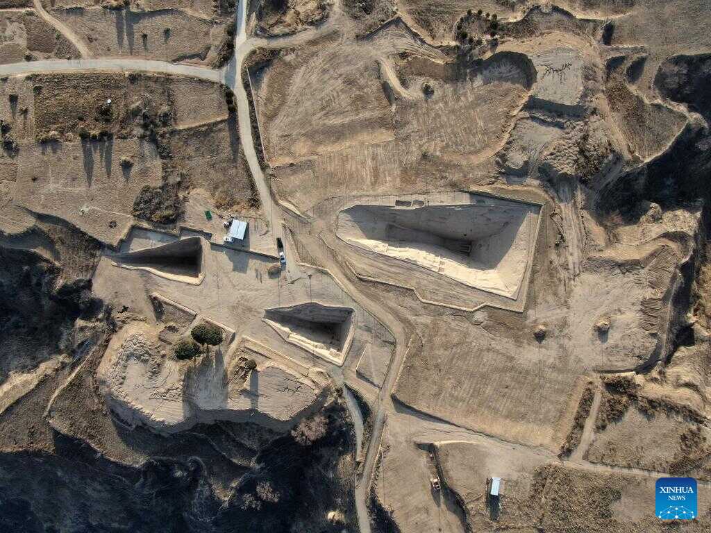 An aerial drone photo taken on Dec. 8, 2025 shows part of the Zhaigou site in Qingjian County, northwest China's Shaanxi Province. The Zhaigou site, a settlement site dating back to about 3,200 years ago, was listed as one of the major field archaeological discoveries during the sixth Shanghai Archaeology Forum (SAF2025) in east China's Shanghai on Tuesday. (Xinhua/Li Yibo)