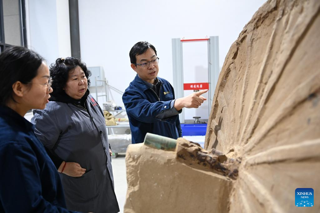 Researchers discuss the cleaning and restoration of a double-shaft chariot unearthed from the Zhaigou site at a laboratory of the Shaanxi Academy of Archaeology in Xi'an, northwest China's Shaanxi Province, Dec. 12, 2025. The Zhaigou site, a settlement site dating back to about 3,200 years ago, was listed as one of the major field archaeological discoveries during the sixth Shanghai Archaeology Forum (SAF2025) in east China's Shanghai on Tuesday. (Xinhua/Li Yibo)