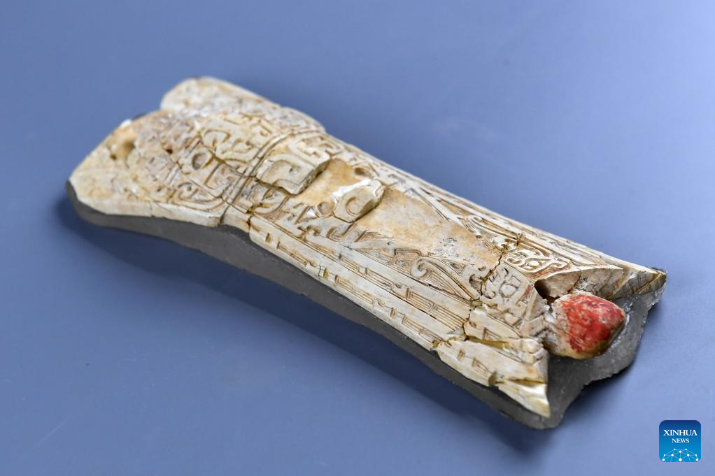 This photo taken on Dec. 8, 2025 shows a carved ivory artifact unearthed from the Zhaigou site in Qingjian County, northwest China's Shaanxi Province. The Zhaigou site, a settlement site dating back to about 3,200 years ago, was listed as one of the major field archaeological discoveries during the sixth Shanghai Archaeology Forum (SAF2025) in east China's Shanghai on Tuesday. (Xinhua/Li Yibo)