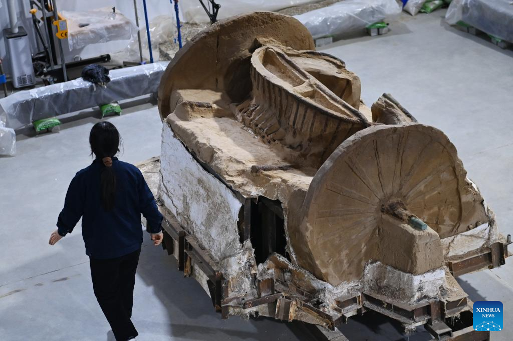 A double-shaft chariot unearthed from the Zhaigou site is pictured at a laboratory of the Shaanxi Academy of Archaeology in Xi'an, northwest China's Shaanxi Province, Dec. 12, 2025. The Zhaigou site, a settlement site dating back to about 3,200 years ago, was listed as one of the major field archaeological discoveries during the sixth Shanghai Archaeology Forum (SAF2025) in east China's Shanghai on Tuesday. (Xinhua/Li Yibo)