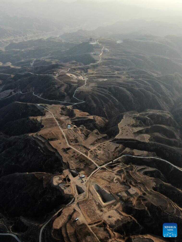 An aerial drone photo taken on Dec. 9, 2025 shows part of the Zhaigou site in Qingjian County, northwest China's Shaanxi Province. The Zhaigou site, a settlement site dating back to about 3,200 years ago, was listed as one of the major field archaeological discoveries during the sixth Shanghai Archaeology Forum (SAF2025) in east China's Shanghai on Tuesday. (Xinhua/Li Yibo)