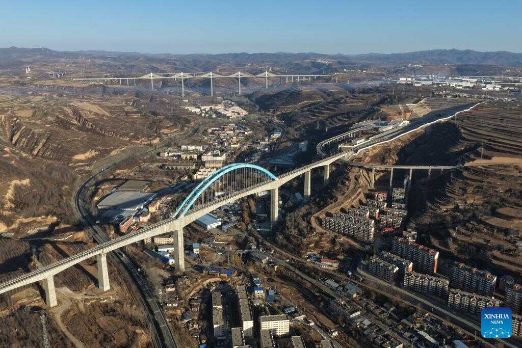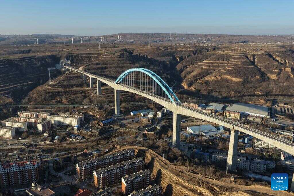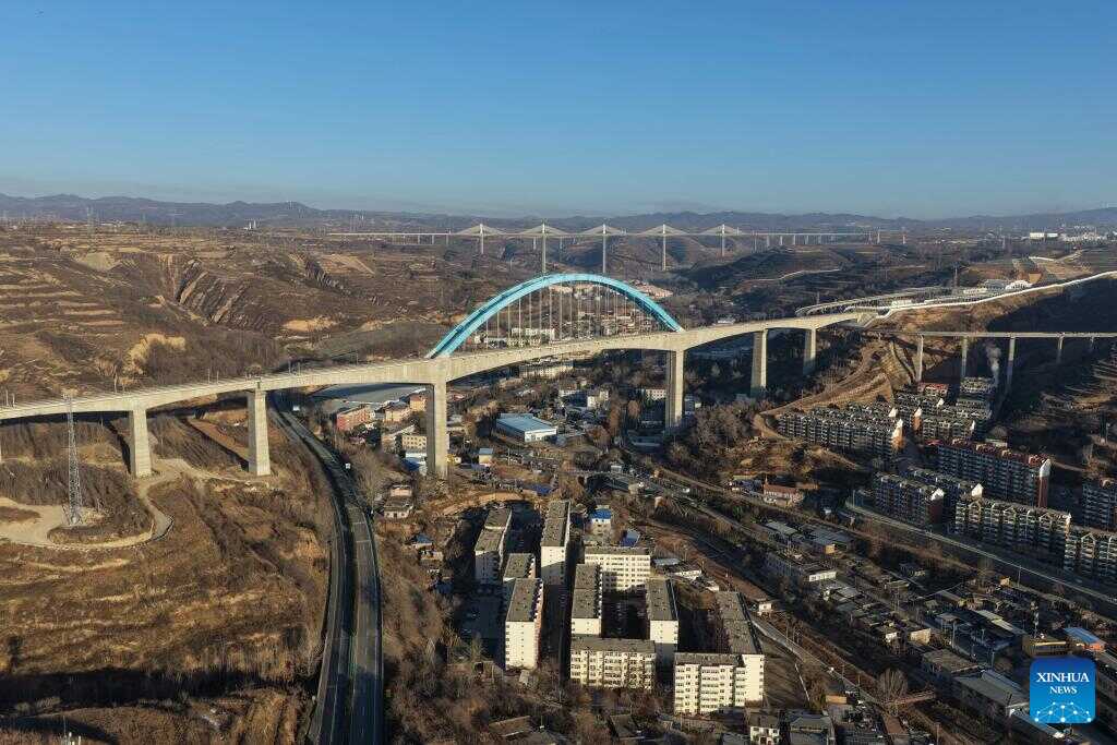 An aerial drone photo taken on Dec. 25, 2025 shows the Wangjiahe grand bridge along Xi'an-Yan'an high-speed railway in Tongchuan City, northwest China's Shaanxi Province. Located in Wangyi District of Tongchuan, the 1,066-meter-long Wangjiahe grand bridge boasts the largest span and highest height along the Xi'an-Yan'an high-speed railway, which is set to commence operations on Dec. 26.