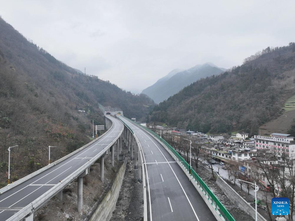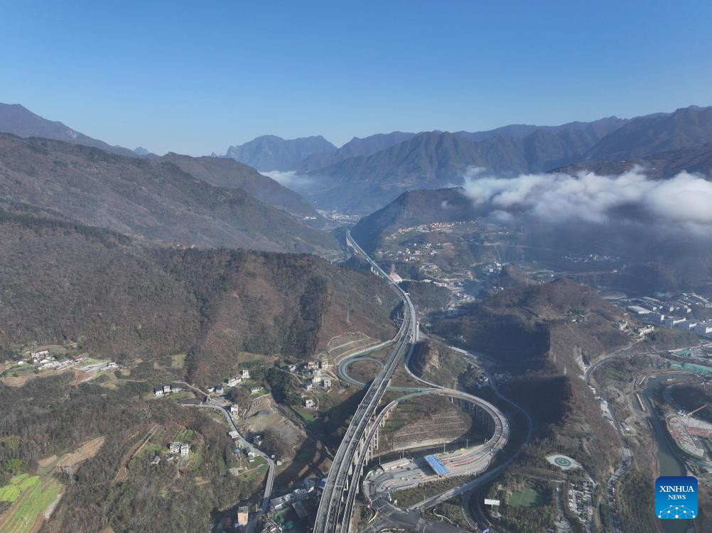 An aerial drone photo taken on Dec. 25, 2025 shows a section of Ankang-Langao expressway in northwest China's Shaanxi Province. With the Langao County to the boundary of Shaanxi and southwest China's Chongqing Municipality section of Ankang-Langao expressway officially opened to traffic on Thursday, the inter-provincial passage that passes through the Qinling Mountains and Daba Mountains and connects Shaanxi and Chongqing was fully completed. (Photo by Ning Zhengang/Xinhua)