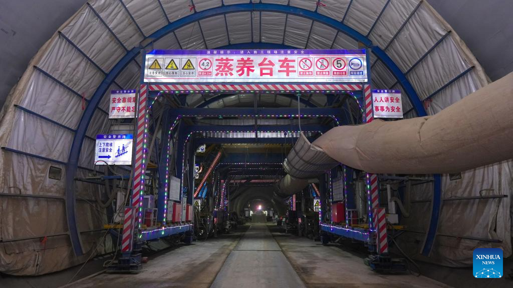 This photo taken on Jan. 27, 2026 shows an interior view of the Jinjiagou tunnel along the Yan'an-Yulin high-speed railway in northwest China's Shaanxi Province. The Jinjiagou tunnel of the Yan'an section along the Yan'an-Yulin high-speed railway was successfully drilled through on Tuesday. The railway, with a designed speed of 350 kilometers per hour, will help to shorten the travel time between Xi'an and Yulin from 5 hours to 2 hours after it is open to the traffic. (Photo by Guo Peng/Xinhua)