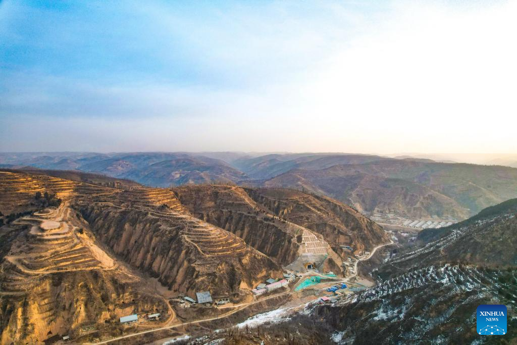 An aerial drone photo taken on Jan. 27, 2026 shows a view of the Jinjiagou tunnel along the Yan'an-Yulin high-speed railway in northwest China's Shaanxi Province. The Jinjiagou tunnel of the Yan'an section along the Yan'an-Yulin high-speed railway was successfully drilled through on Tuesday. The railway, with a designed speed of 350 kilometers per hour, will help to shorten the travel time between Xi'an and Yulin from 5 hours to 2 hours after it is open to the traffic. (Photo by Guo Peng/Xinhua)