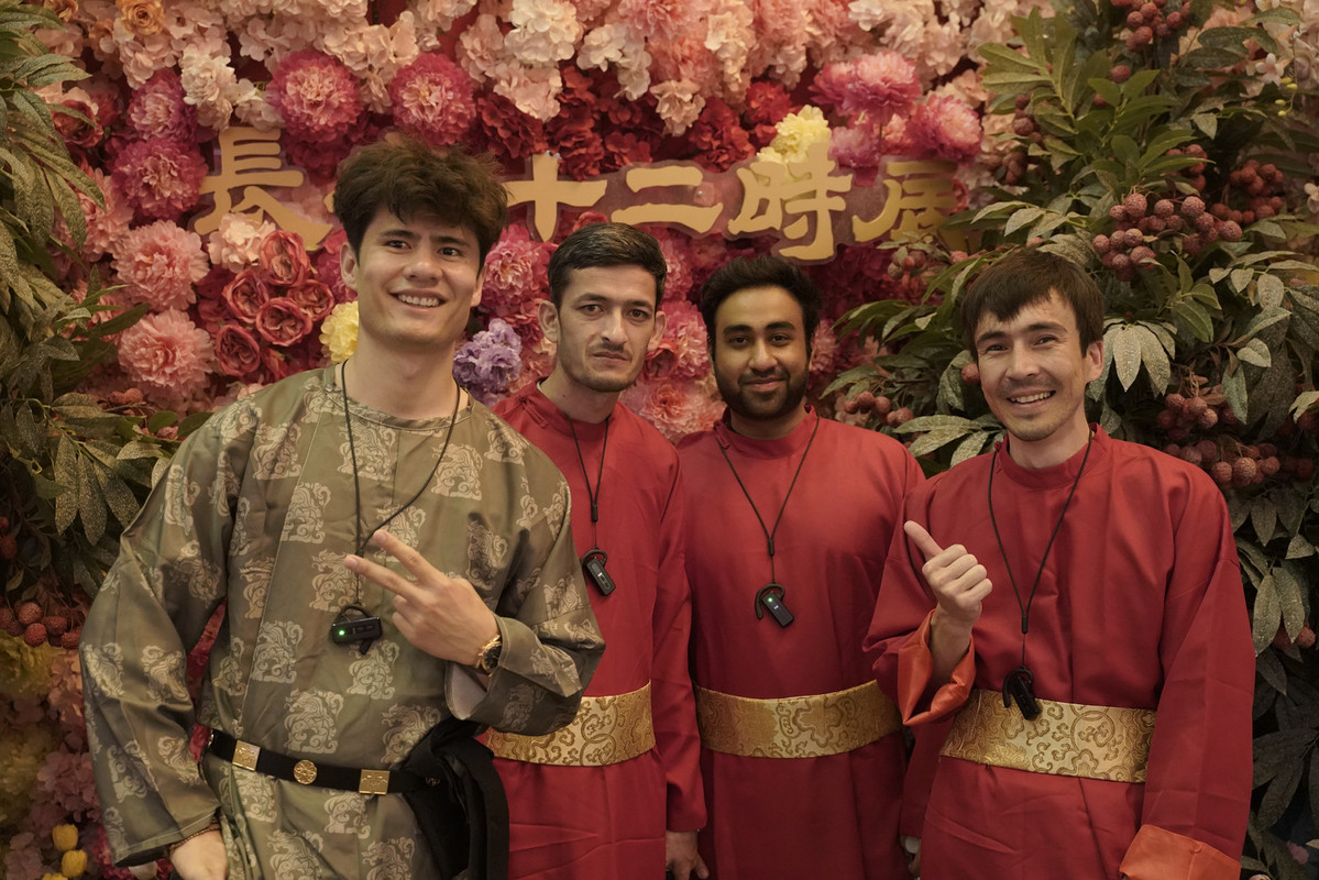 Hasanbayev Agabek (left), a student from Turkmenistan, visits the Twelve Hours of Chang'an block in Xi'an. [Photo provided to chinadaily.com.cn]