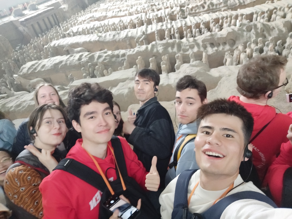 Hasanbayev Agabek (front row, right), a student from Turkmenistan, visits the Emperor Qinshihuang's Mausoleum Site Museum. [Photo provided to chinadaily.com.cn]