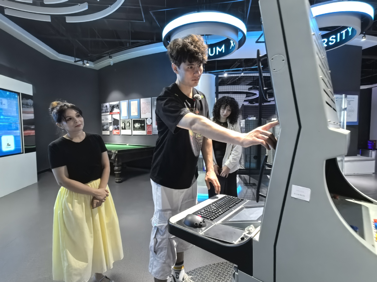 Hasanbayev Agabek (middle), a student from Turkmenistan, visits the Museum of Xi'an University of Electronic Science and Technology. [Photo provided to chinadaily.com.cn]