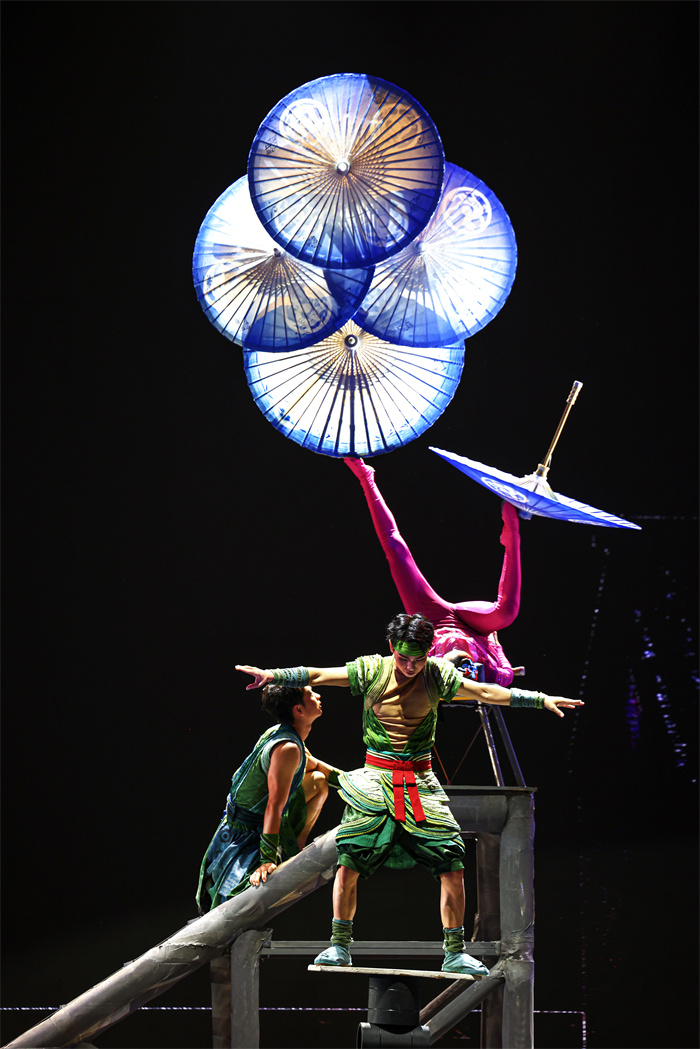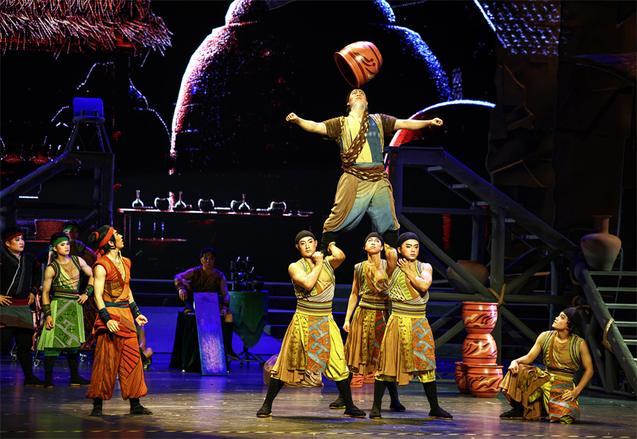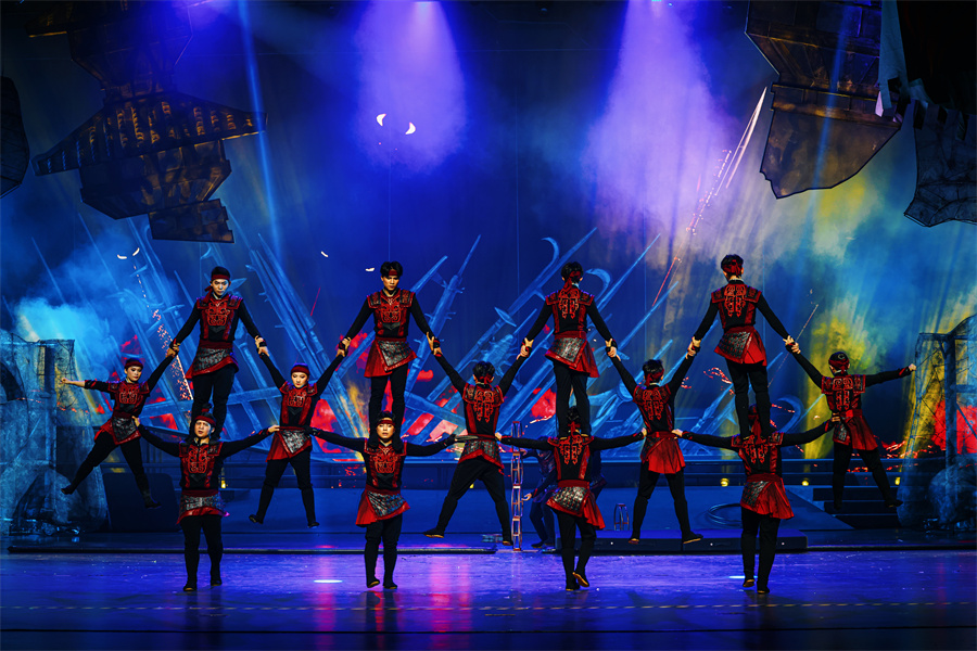 A scene from One Finger Across the Millennium, a new acrobatic drama, which premiered in Xi'an, Shaanxi province, on Sept 4, featuring acrobats from the province. [Photo provided to China Daily]