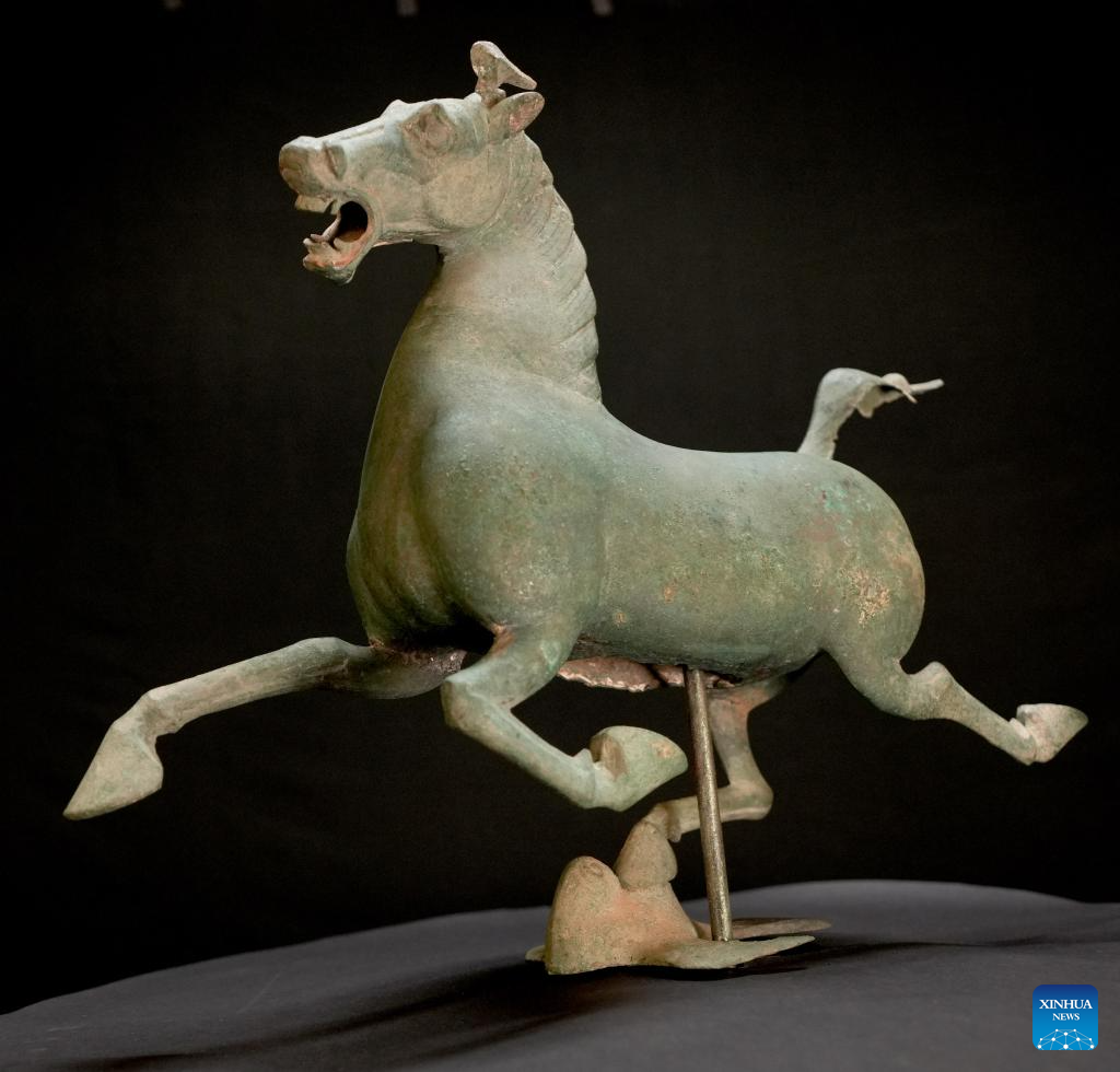 This photo taken on Oct. 27, 2023, shows the side view of an ancient bronze horse statue at Gansu Provincial Museum in Lanzhou, capital of northwest China's Gansu Province. The bronze horse statue, popularly known as "Bronze Galloping Horse Treading on a Flying Swallow," was unearthed in the 1960s from the Leitai Tomb of the Eastern Han Dynasty (25-220) in Wuwei, Gansu, and is now preserved in Gansu Provincial Museum. Its image became a symbol of Chinese tourism in 1983. (Xinhua/Wang Yuguo)